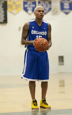 Chris Brown showed off his slam dunk skills during the E League Bridge Basketball and Charity Event at Santa Monica High School on Sunday (March 6). The blond baller, wearing a blue Orlando jersey and yellow sneakers, proved to be a formidable force on the court, sinking numerous shots during the game.